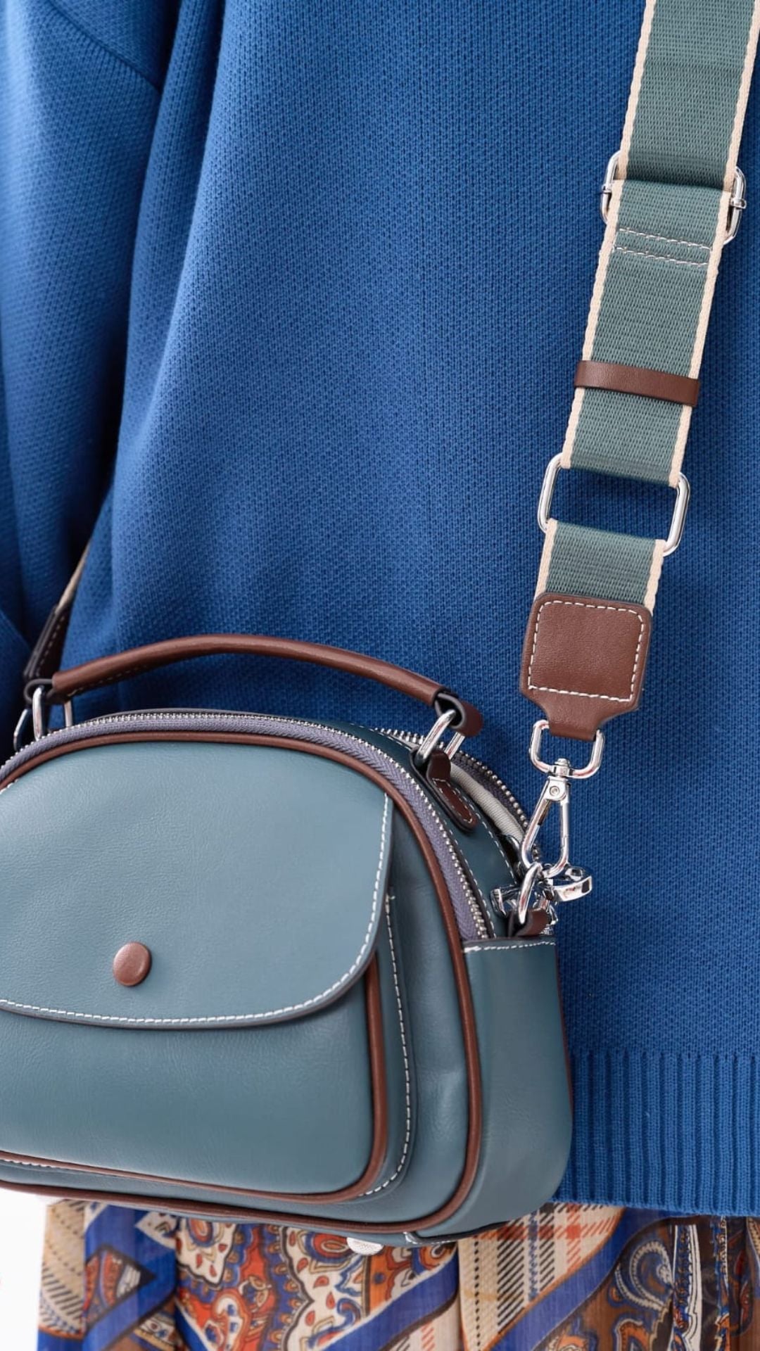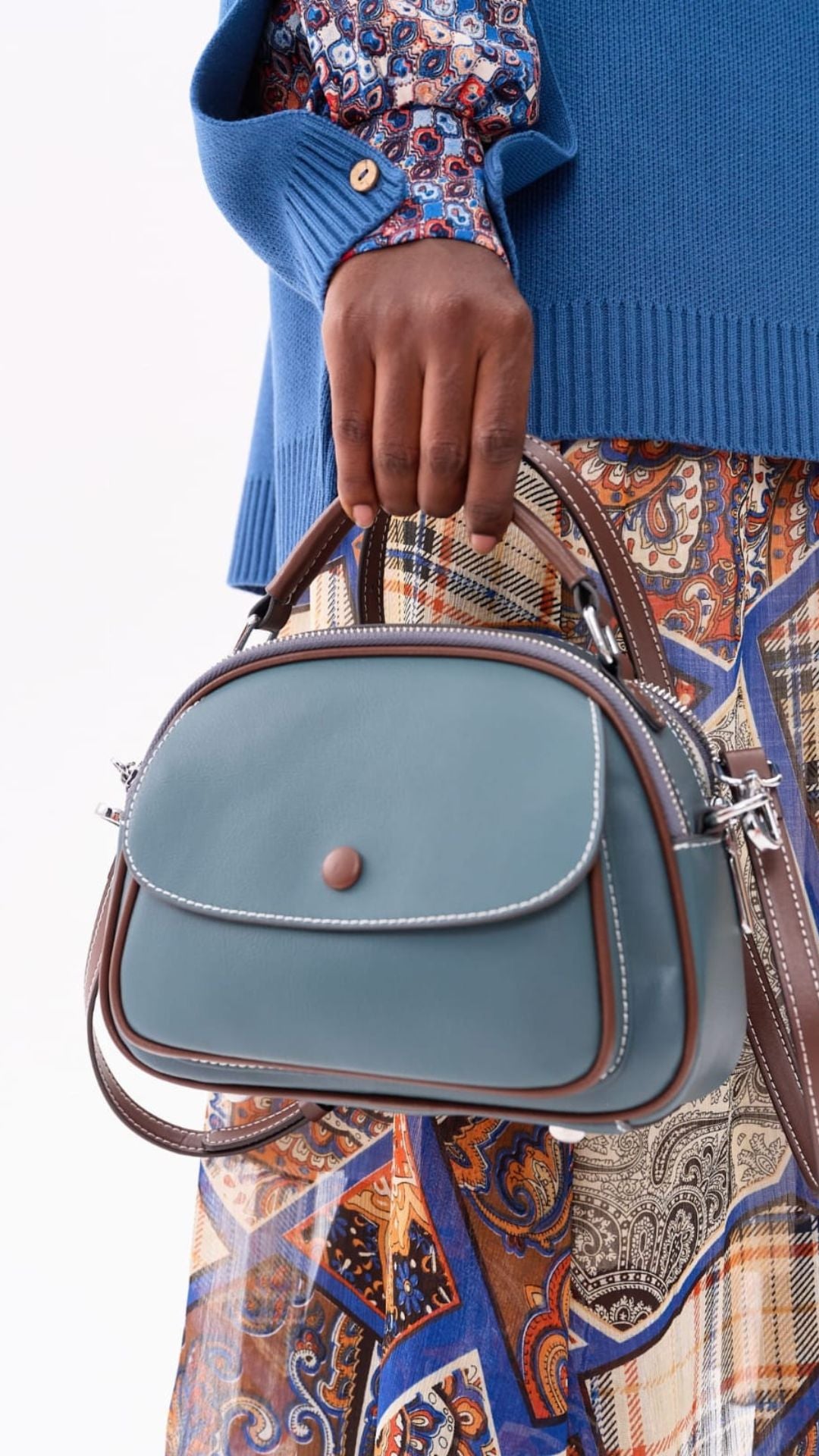 Pelēcīgi zila ādas soma ar brūnu apdari.
