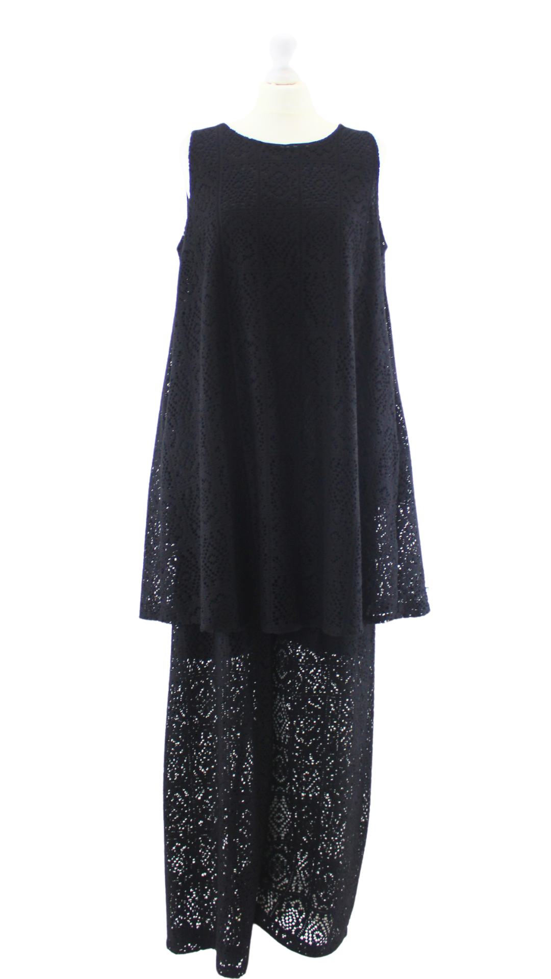 Bikškostīms ar mežģīņu rakstu. Augšdaļai ir kabatas. Bikses ar gumiju.