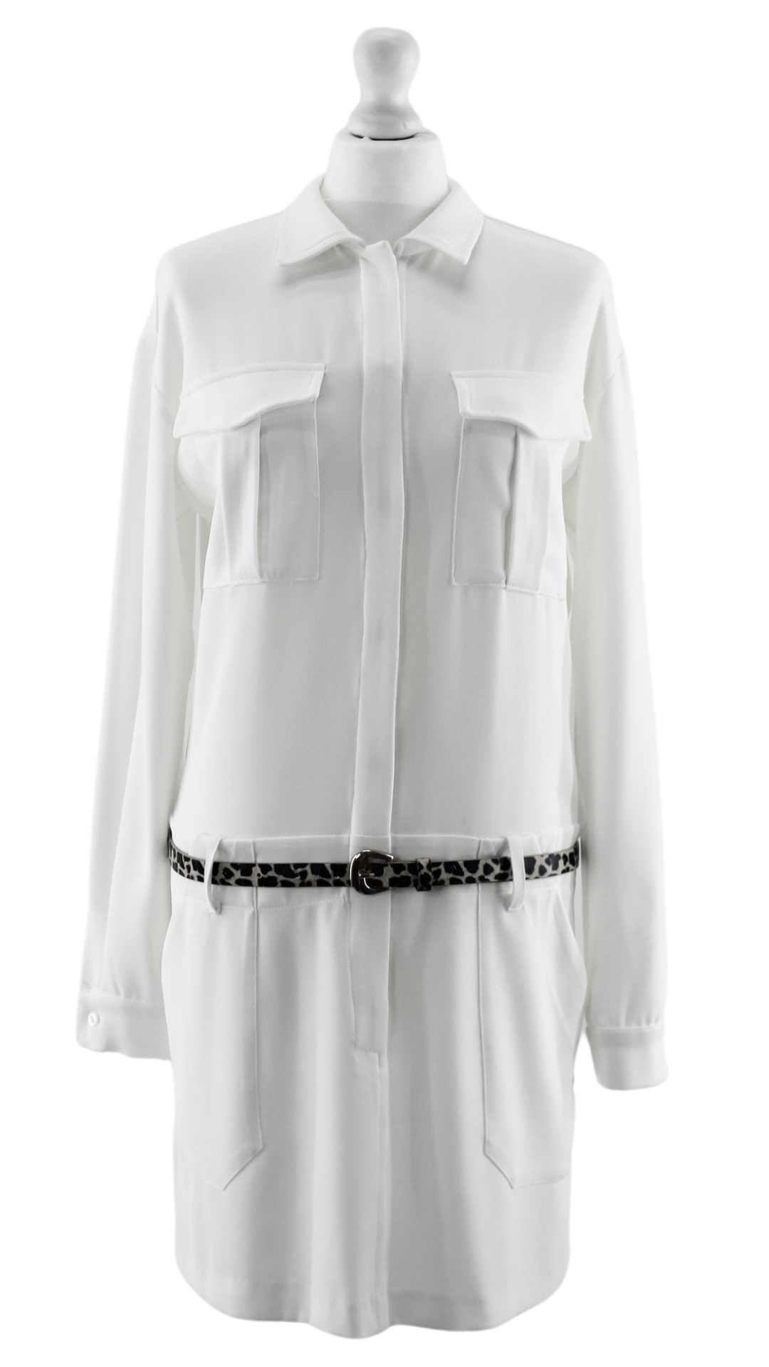 Gara balta blūze ar jostu. Blūzei ir kabatas. Jostai ir leoparda raksts.