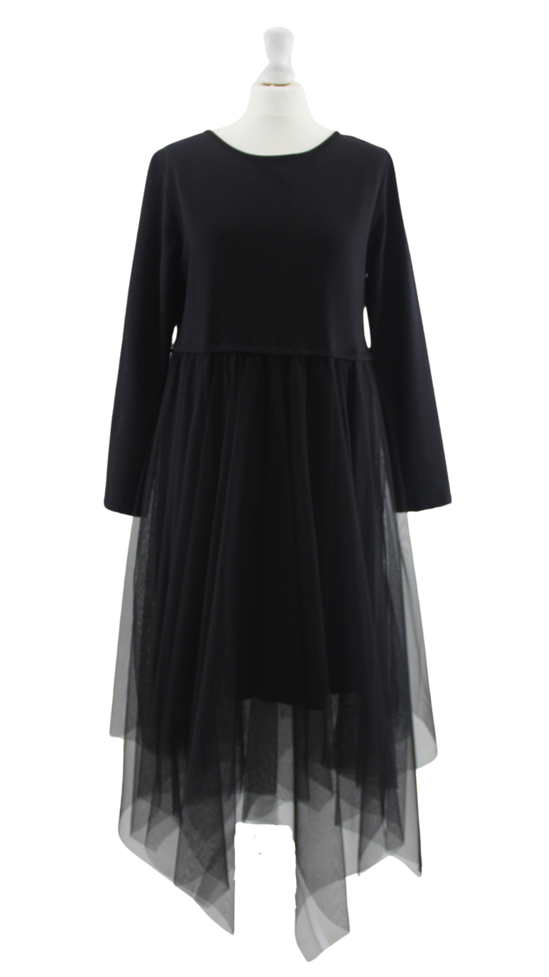 Melna kleita ar garām piedurknēm un tilla svārku daļu.