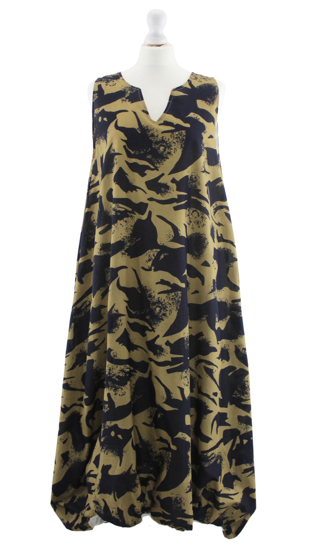 Kleita ar raibu rakstu un balonveida svārku daļu