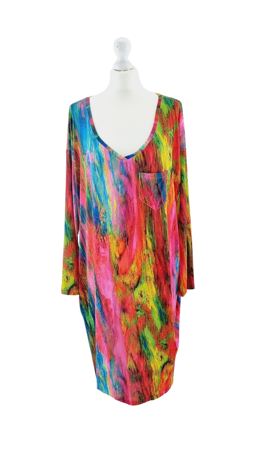 Rozā kleita sievietēm ar kabatām un pagarinātu aizmuguri.