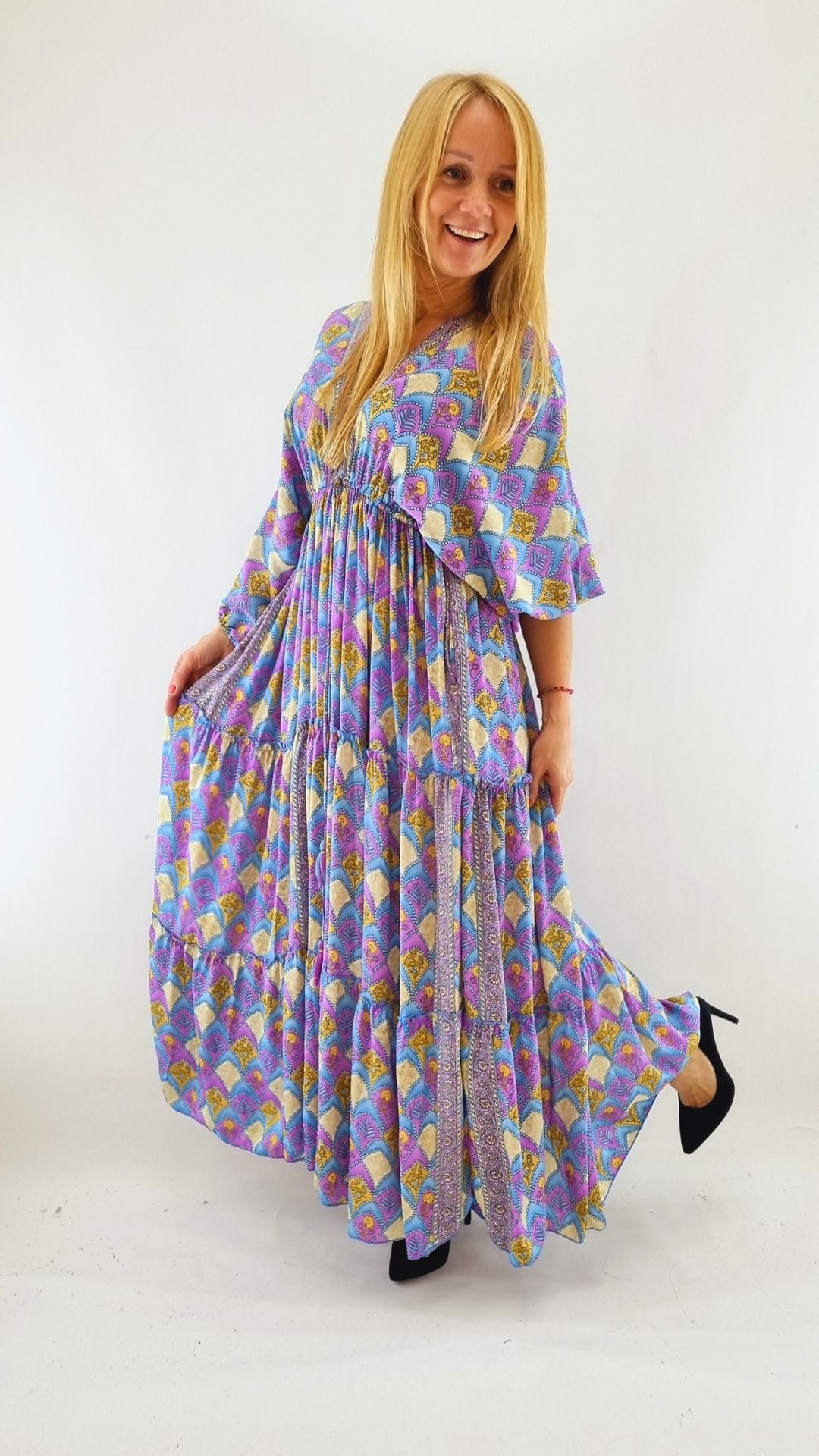 Vasaras kleita gara ar kabatām un V veida izgriezumu mugurpusē. Kleitai kupla svārku daļa. Zem krūtīm kleita savelkas ar lenti.