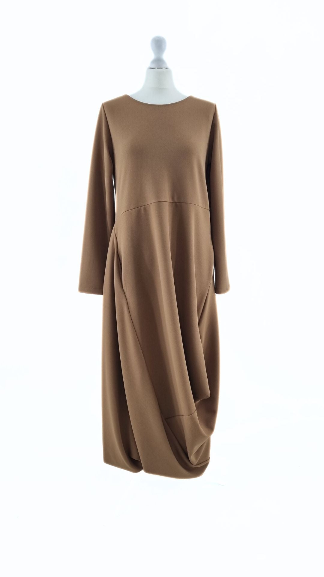 Vienkrāsaina kleita ar asimetrisku svārku daļu.