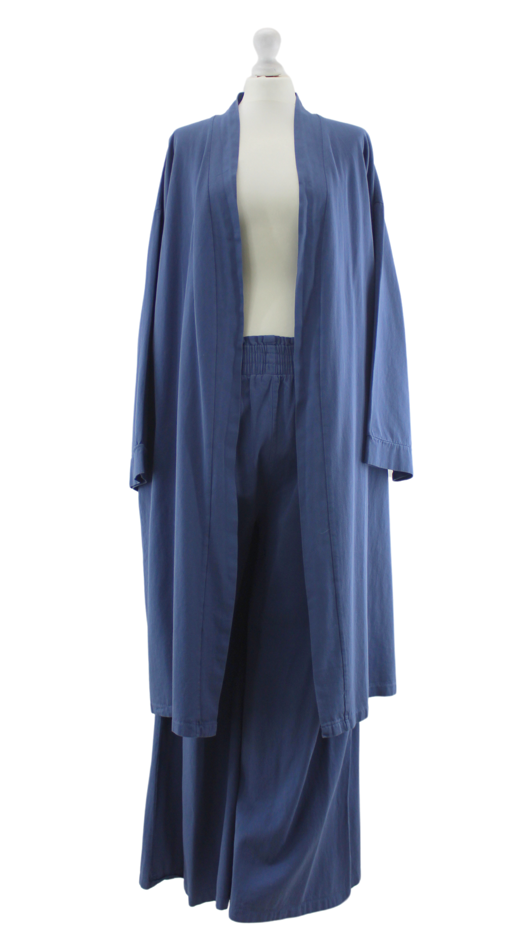 Zils kokvilnas bikškostīms. Bikses platas, uz gumijas un ar kabatām.